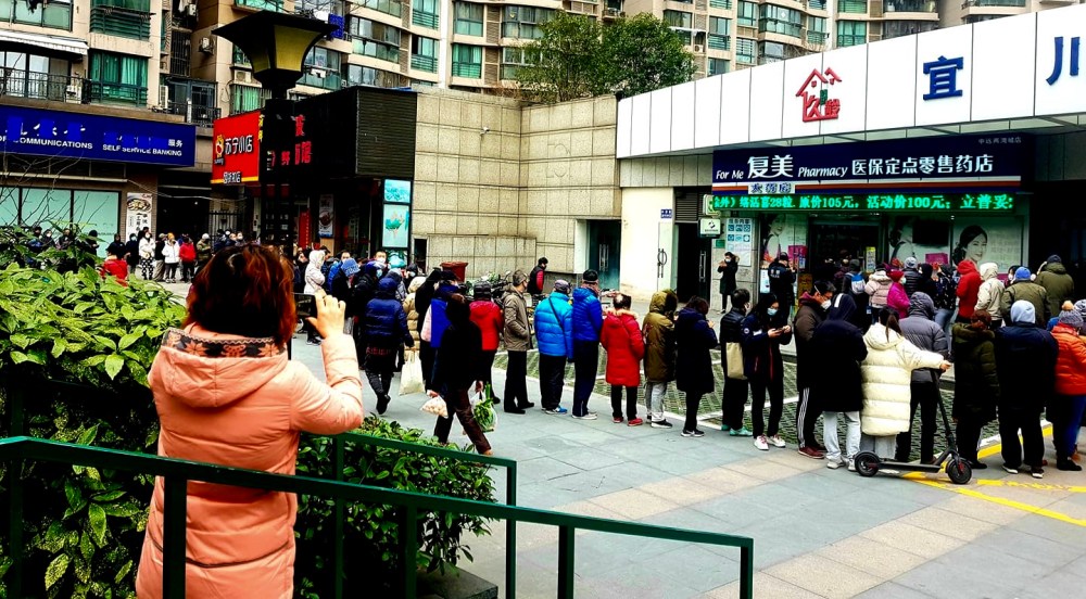 Hearing a commotion, you turn a corner and find a crowd of people lining up to get into a soon-to-open pharmacy to buy masks and hand sanitizer. Four policemen inside the entrance are laughing and getting ready to control the eager crowd, which is lugubrious – with nerves, perhaps – and forms a serpentine line so long one woman is photographing it.