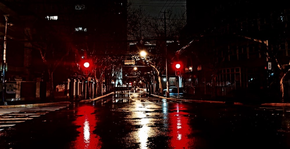 You grab your twelve-kuai umbrella from the stand by the door, duck out onto rainy dark Wuding Road, and turn towards the corner, walking across dark rainy Jiaozhou Road and admiring the reflections of the tail lights of the empty bus that passes you and recedes beautifully down the shiny wet black street, painting auroras on the asphalt.