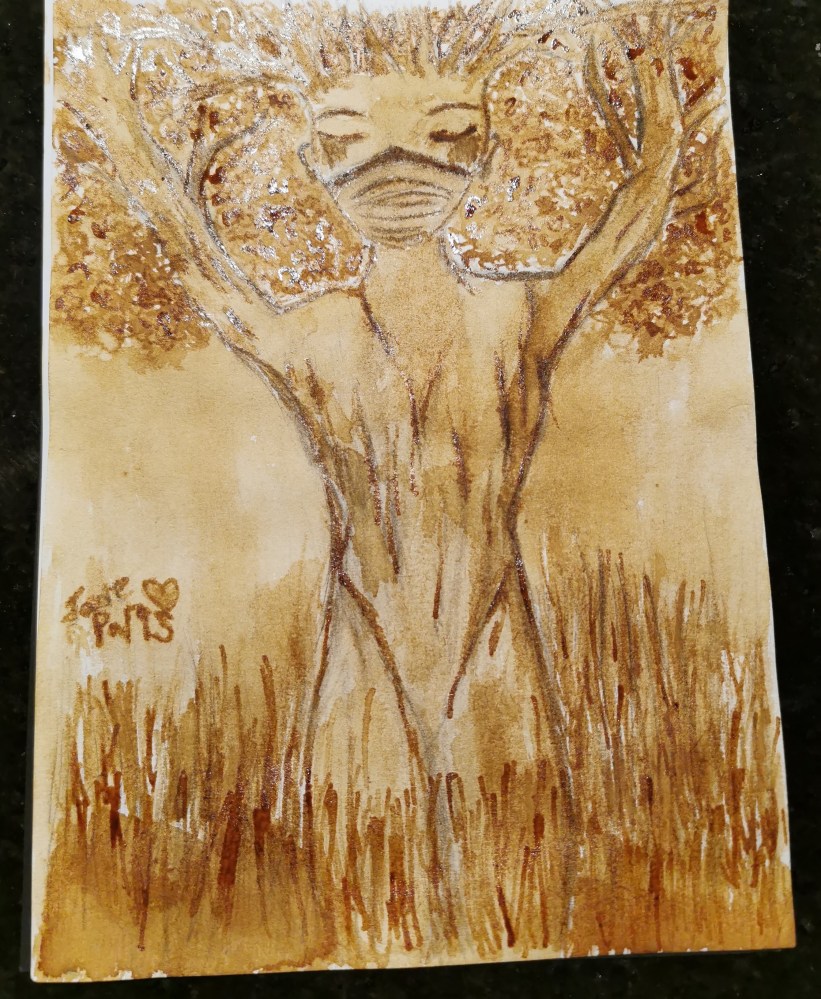 ‘She Weeps’ is a collaboration between Jade-Ceres Munoz and her 8-year-old daughter Paris Alexandra Munoz. Jade created the base drawing while she and Paris painted the artwork using coffee on an A4 paper. The idea for the artwork came about when Paris was thinking about how Mother Nature must feel amid the global pandemic.