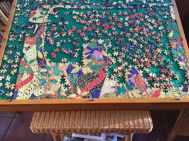 Over our five-week level Four Lockdown I started a jigsaw: ‘The Hunt’ by Robert Burns. Precision cut, highly stylised and difficult. Sometimes I would only manage one piece a day. Had my ability for defining subtleties of tone deserted me or was I distracted? So anxious to see some sign of otherness going up the steps beyond the sunroom window, that my eye could not focus on what was in front of me. If I saw movement, I opened the bifold windows and called out. Not dissimilar to the way anyone imprisoned will seek solace in a small patch of blue.