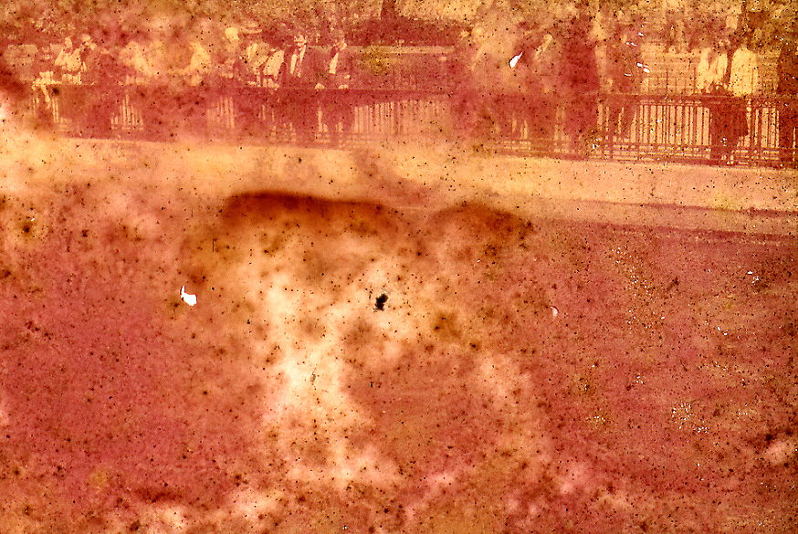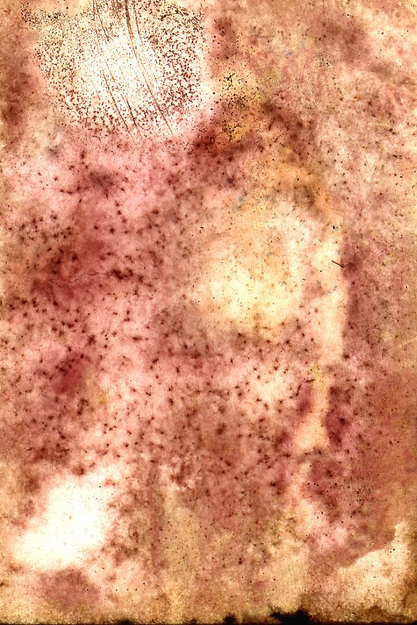 In 1999, the collection suffered a nearly incomprehensible accident. Stored temporarily in a cottage basement on Pender Island, Canada, they were soaked by a water heater malfunction. The damage was not discovered for some months. The emulsion of 95% of the images had literally ‘melted’ into fields of color and as well were covered with dirt and mold.