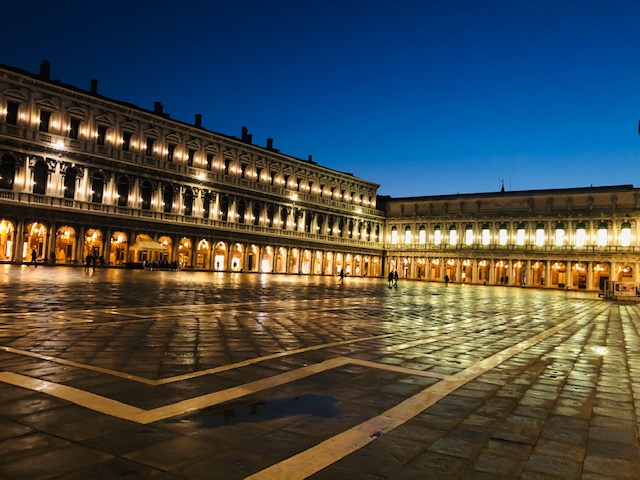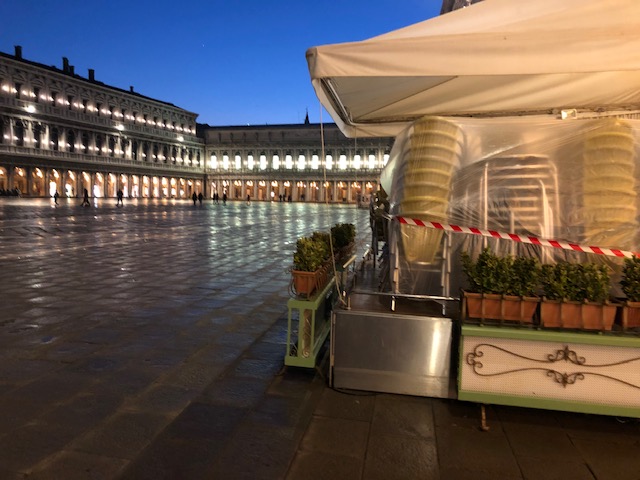 Now that it is allowed, I go to Venice every Friday, to enjoy this different place. I take the empty vaporetto out past Santa Marta and the shipyards, into the belly of the lagoon, coming up past the Zattere towards the pearly Doge’s Palace and San Marco, then get off at the Giardini and walk along the waterfront. A dusky windy walk, barely anyone about. When I enter the labyrinth of buildings the shops are all closed; many shutters are down and you know they will not open again, ever. For a while the bars take orders outdoors until 6pm so you rush to get a seat in a tiny campo with cold sun; where every random conversation is infused with survival and joy. Prosecco because things are better, not really, but perhaps. One afternoon a man asks me to marry him; another day I befriend an artist whose partner produces Cocteau-style ceramics – something to indulge in, a return to art. There is grief and awe everywhere. Stillness. Echoes. I pace and pace into the darkness, not wanting to leave the slow lilting panorama, not wanting the tourists to come back with their pushy streams of I-own-this-place-for-a-day, their unremarkable selfies. These nights, Venice is mine.
