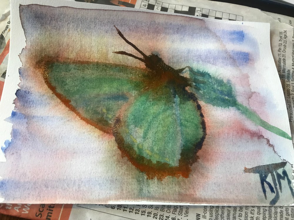 I notice the eyes, and the light at the centre of the wings. I tune into the delicacy of the antennae. I think: this was a grub. The internal critic pops up. She says: that wing is not quite symmetrical, the paint has bled outside the wings and you’ve used too much green. I say: I’m not doing this for you. I’m painting to ‘just sit with it.’ The internal critic says: oh. She goes quiet.