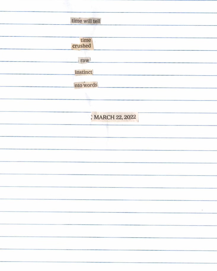 I revert to cut-ups when I’m too distracted, depressed, dumbfounded or deranged to write in the regular manner. My sources include newspaper articles, sacred and profane texts, assorted print ads, packaging copy, and pretty much any other reading matter that comes to hand. In lieu of computer keyboard, pen and ink, my primary instruments are a razor blade, scissors, tweezers, and glue. With little or no initial conscious intent, I skim the source text vertically and let my eye idle down the page, thereafter circling, cutting out, or copying seemingly random words and word combinations that strike my fancy. Telling snippets come together by what I call magnetic imminence.