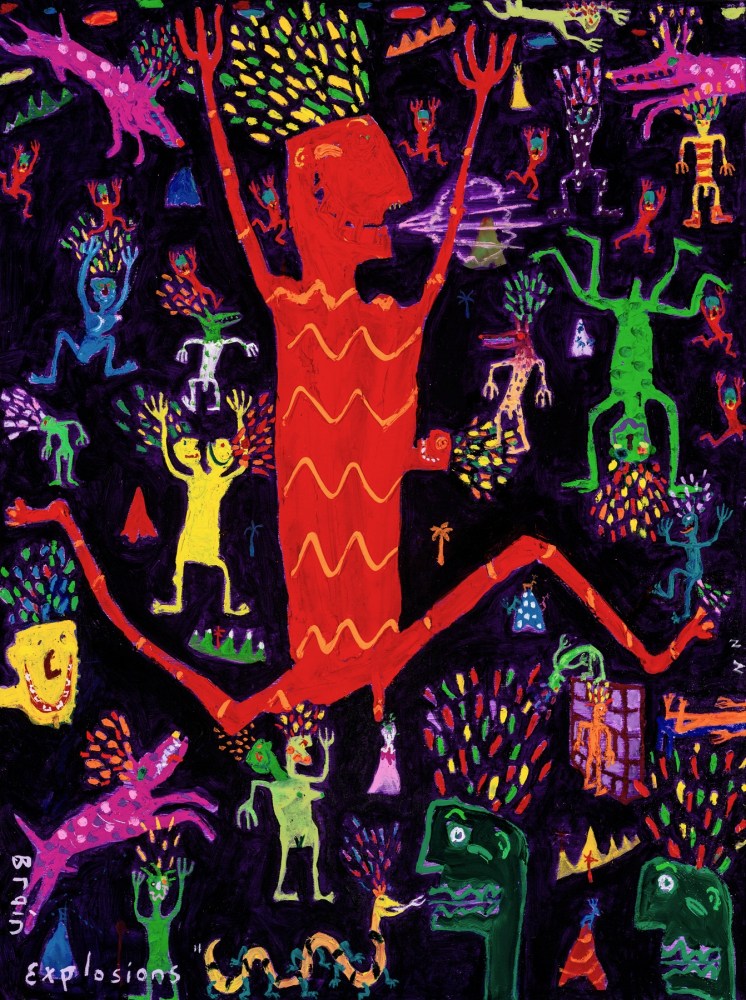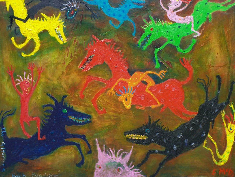 McDougall describes himself as an expressionist artist, influenced by the likes of Karel Appel and the German expressionists, but also the Old Masters. References to art history, literature, mythology and music abound in his hyperglycemic canvases. The work of expressionist forebears, cave painting, Rhythm and Blues songs, Greek mythology and Biblical kings are all grist for the mill as subject matter for these paintings. There are also affinities with the street art-informed work of Jean Michel Basquiat with his gurning, cockeyed characters, as well as the unmoored souls that haunt many works of art brut.